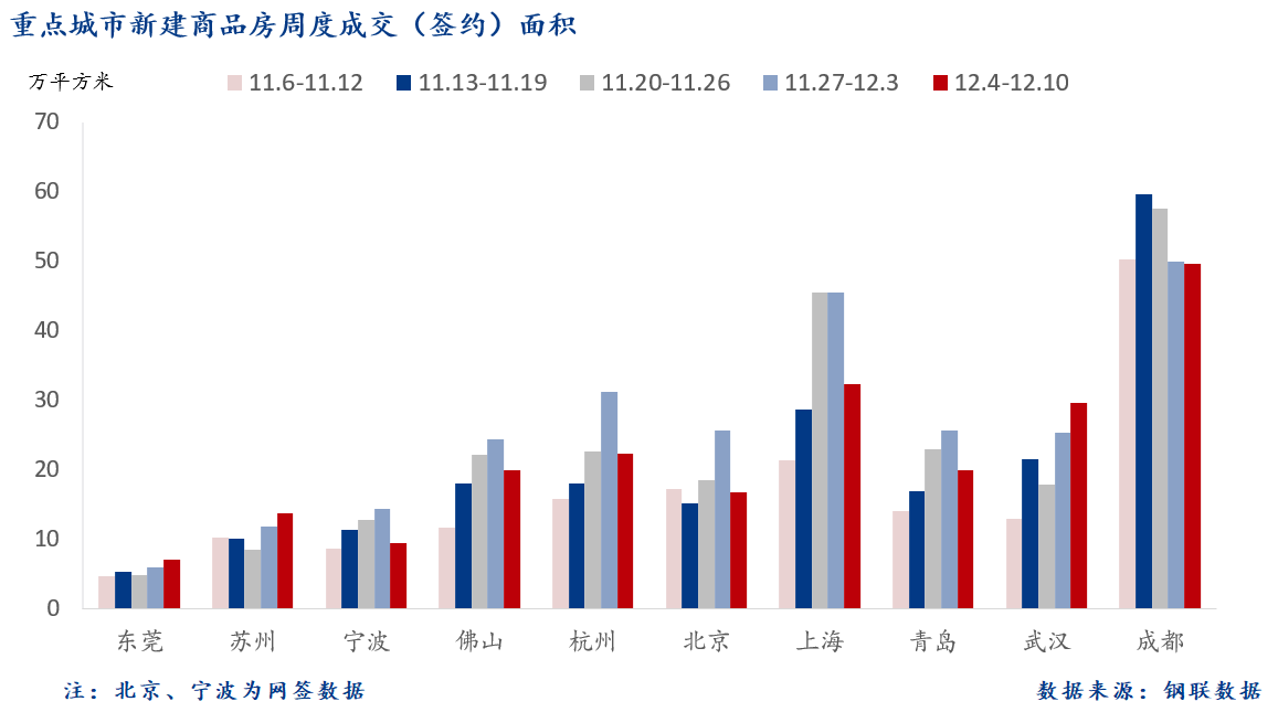 Mysteel統(tǒng)計了北京、上海、杭州、寧波、武漢、成都、佛山、青島、東莞及蘇州10個重點城市新建商品房周度成交(簽約)情況。具體如下: