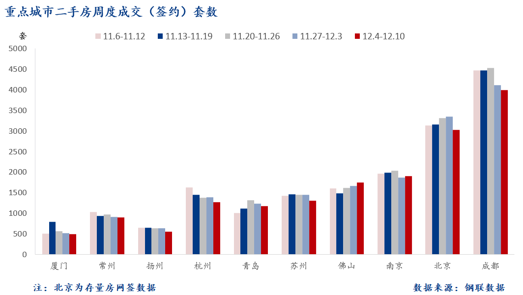 Mysteel統(tǒng)計了北京、杭州、成都、揚州、青島、南京、佛山、常州、蘇州及廈門10個重點城市二手房周度成交(簽約)情況。具體如下: