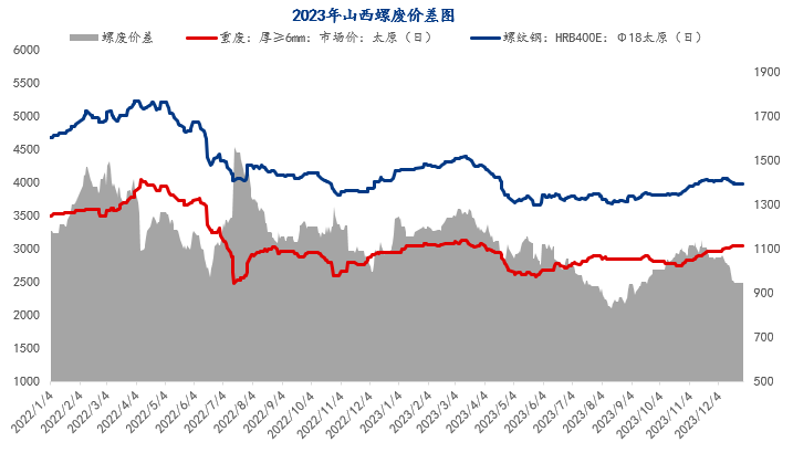 需求方面,2023年山西區(qū)域鋼廠多數(shù)時期處于虧損狀態(tài),廢鋼需求不佳,從螺廢價差來看,山西市場螺廢價差全年處于低位,整體低于去年,三四季度,在鋼材價格上行的帶動下,螺廢價差穩(wěn)步上行,鋼廠利潤好轉(zhuǎn),同時疊加鋼廠冬季累庫需求,四季度山西區(qū)域廢鋼需求達(dá)到年內(nèi)高位。