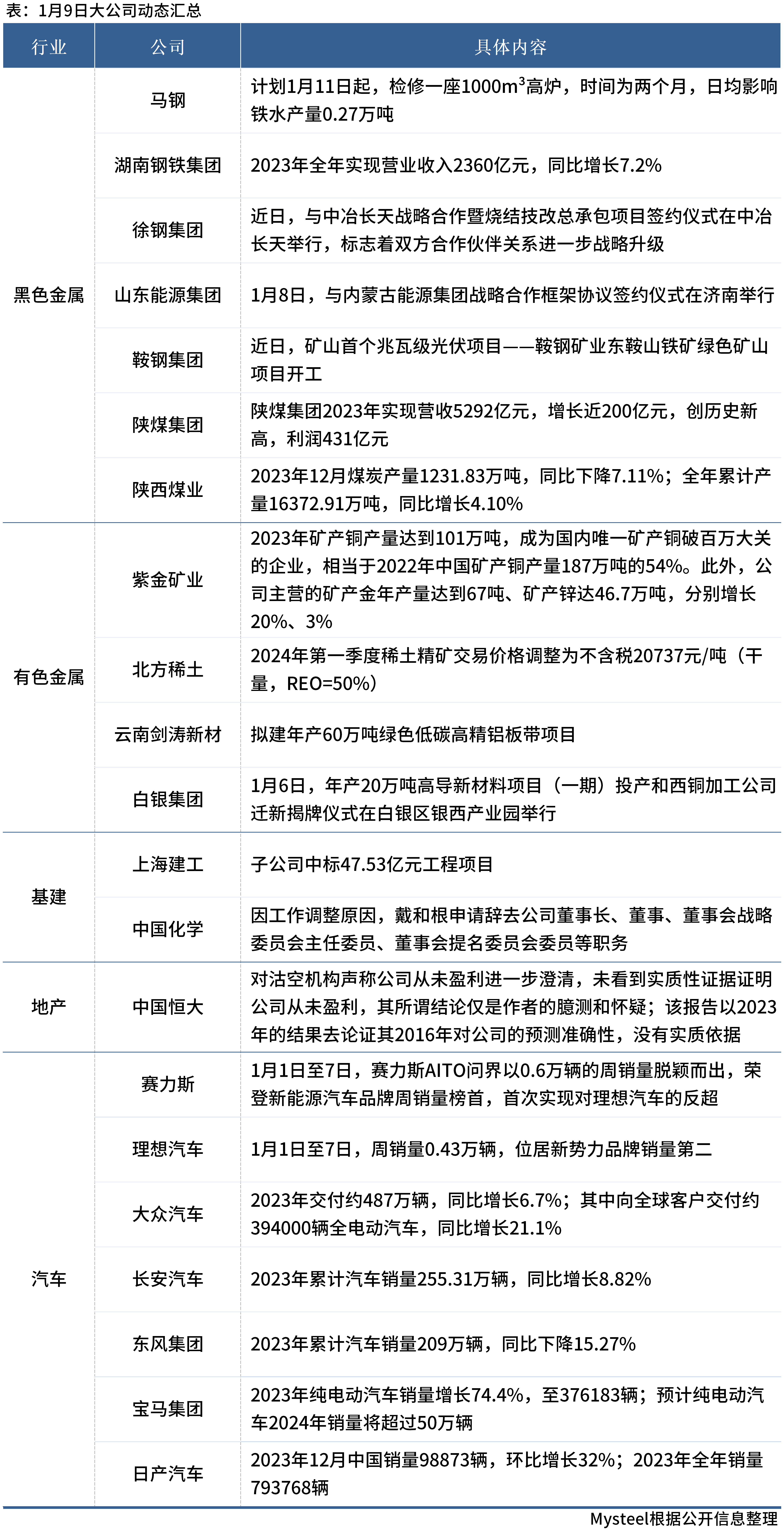 馬鋼計劃1月11日起,檢修一座1000m3高爐,時間為兩個月,日均影響鐵水產(chǎn)量0.27萬噸;陜西煤業(yè)2023年年累計煤炭產(chǎn)量16372.91萬噸,同比增長4.10%;湖南鋼鐵集團2023年實現(xiàn)營業(yè)收入2360億元,同比增長7.2%。