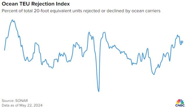 航運平臺Xeneta警告說,運費可能會在6月上漲,漲幅將超過紅海危機引發(fā)的漲幅,最終打擊消費者價格。