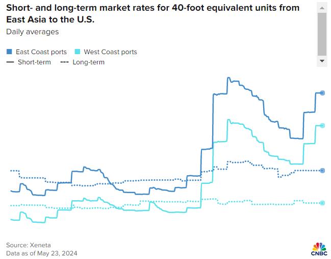 2024年初,紅海緊張局勢引發(fā)現(xiàn)貨運費急劇上升,隨后有所下降,但自4月底以來,通往美國海岸航線的現(xiàn)貨運費開始飆升,平均漲幅高達1500美元,運營商收取的最高合同價格可以達到一個月前的兩倍多。