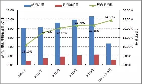“十三五”期間,我國生鐵產(chǎn)量38.8億噸,比“十二五”增加4.1億噸,增幅11.9%;粗鋼產(chǎn)量46.3億噸,比“十二五”增加7.5億噸,增幅19.3%;煉鋼消耗廢鋼鐵8.74億噸,比“十二五”增加4.34億噸,增幅98.6%;廢鋼綜合單耗188.8千克/噸,比“十二五”增加75.4千克/噸,增幅66.5%(其中:轉(zhuǎn)爐鋼單耗139.7千克/噸,比“十二五”增加69.8千克/噸,增幅99.9%;電爐鋼單耗657.5千克/噸,比“十二五”增加53.9千克/噸,增幅8.9%;煉鋼廢鋼比18.88%,比“十二五”增加7.54個百分比;電爐鋼比9.5%比“十二五”增加1.3個百分比。